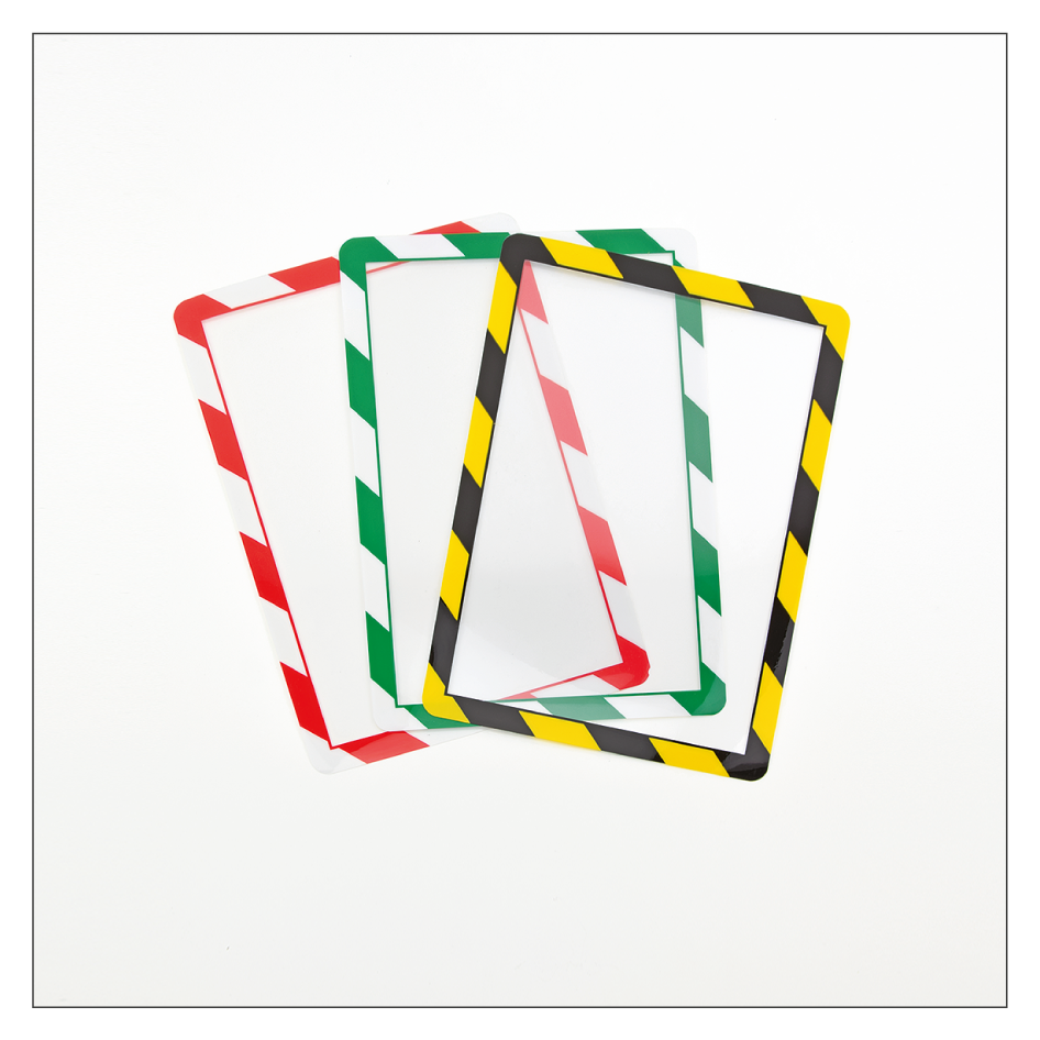 Selbstklebende Kennzeichnungsrahmen eignen sich hervorragend zur Aufnahme wichtiger Informationen wie Anweisungen, Gebote, Verbote, Warnhinweise und andere Kennzeichnungen in Betrieben, Schulen, Bibliotheken und Verkaufsräumen. Ein Kennzeichnungsrahmen besteht aus einem stabilen, transparenten PVC-Kunststoff und ist rückseitig mit einem umlaufenden Farbrahmen bedruckt, der dreiseitig mit doppelseitigen Klebestreifen ausgerüstet ist. Eine Seite des Rahmens ist offen, so dass nach der Positionierung selbstgedruckte Dokumente leicht eingeschoben, aber auch jederzeit gewechselt werden können. Bedingt durch die Platzierung hinter der transparenten Folie des Kennzeichnungsrahmens, sind Ihre Informationen vor Verschmutzung geschützt, dennoch sehr gut lesbar. Unsere selbstklebenden Kennzeichnungsrahmen sind in fünf Grundfarben und drei zweifarbigen Warnmarkierungen für eine ansprechende und dauerhafte Präsentation von Informationen jeglicher Art in diversen Formaten erhältlich. Die Verwendung der Kennzeichnungsrahmen ist sowohl im Hoch- als auch Querformat möglich.