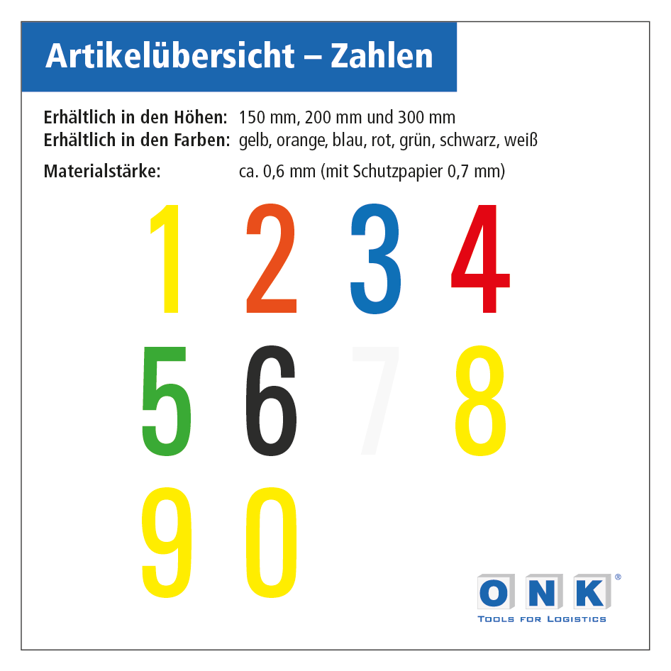 Selbstklebende Ziffern / Zahlen sind Bodenkennzeichnungselemente, die in Lagerhallen, Produktionsstätten und vielen anderen Arbeits- oder Sicherheitsbereichen zum Einsatz kommen, wo es auf eine eindeutige Standortbestimmung ankommt – z.B. von Palettenstellplätzen oder bestimmten Flächen. Unsere Zahlen sind äußerst strapazierfähig und auch für starke Beanspruchung durch Fahrzeuge (Stapler etc.) geeignet. Die Ziffern sind selbstverständlich auch für langlebige Verklebungen an Wänden oder Türen geeignet.