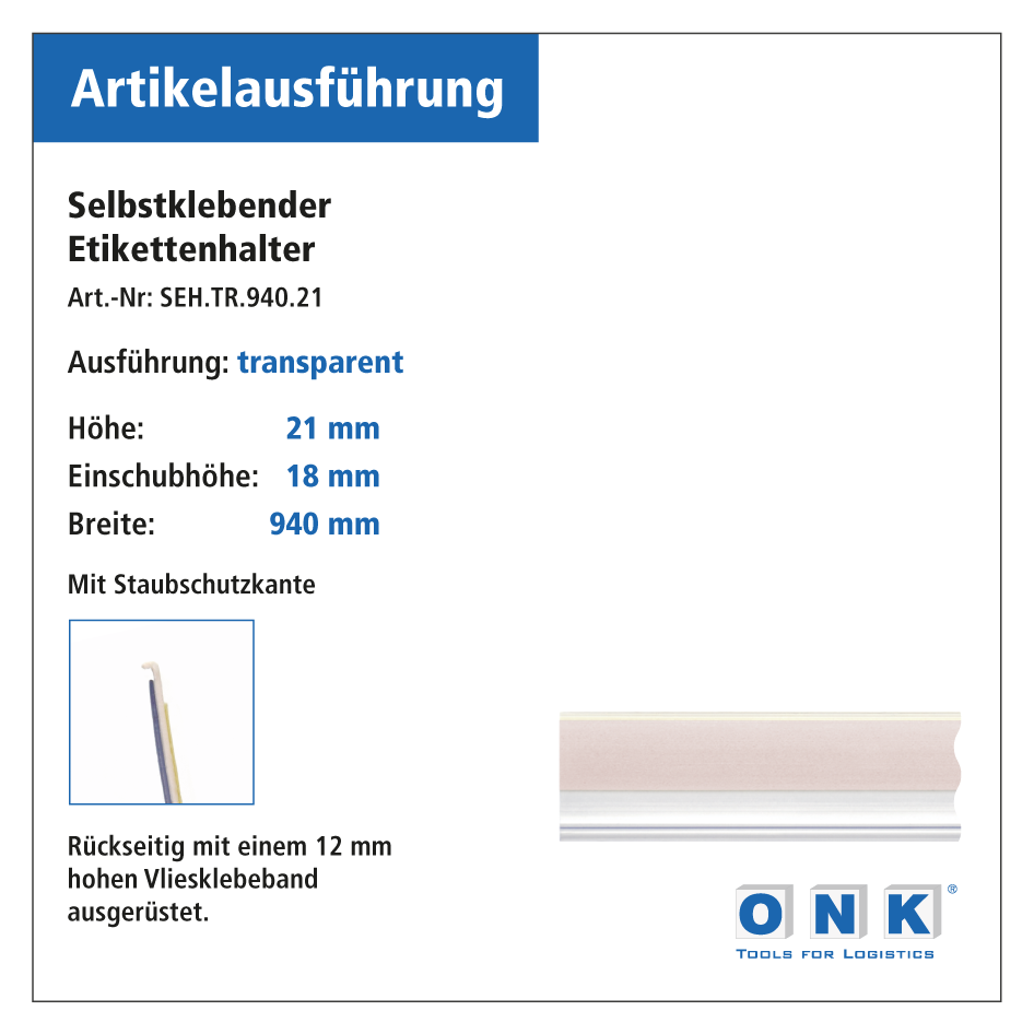 Etikettenhalter 940 x 21 mm, selbstklebend, transparent - 75 Stück