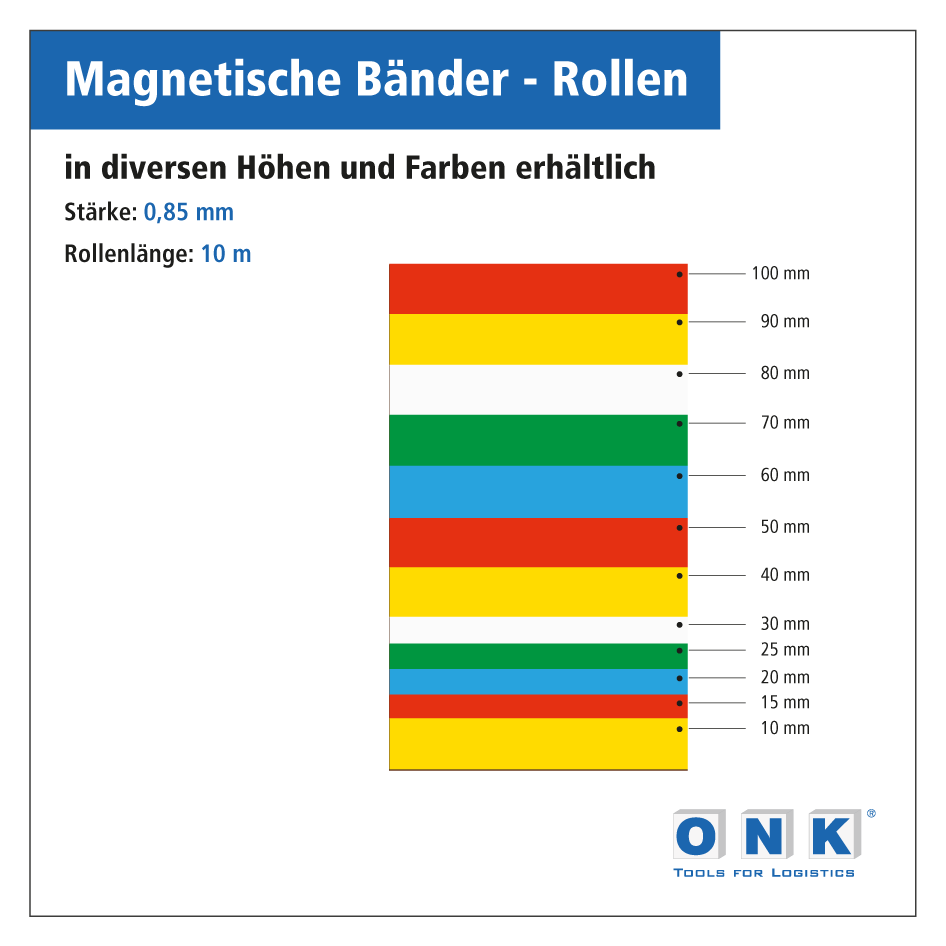 Magnetbänder auf Rolle sind eine ausgezeichnete Beschriftungslösung für häufig wechselnde Lagerplätze. Sie haften auf allen ferromagnetischen (eisenhaltigen) Oberflächen, sind flexibel und haben den großen Vorteil, sich jederzeit rückstandsfrei lösen zu lassen. So ist bei Bedarf eine erneute Nutzung jederzeit möglich. Unsere Magnetbänder in Rollenform eignen sich hervorragend für handschriftliche Kennzeichnungen mit handelsüblichen Faserstiften, können aber auch mit selbstklebenden Etiketten beklebt werden. Individuelle Zuschnitte lassen sich ganz leicht mit einer Schere oder einem Messer ausführen.