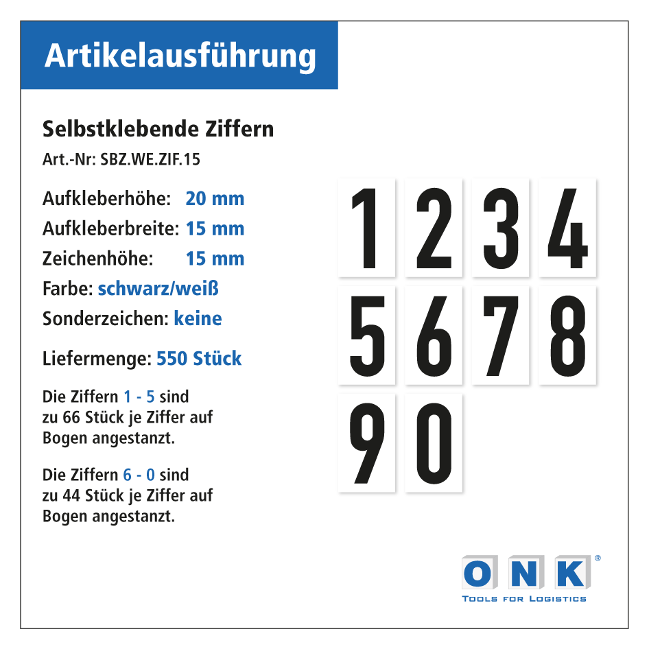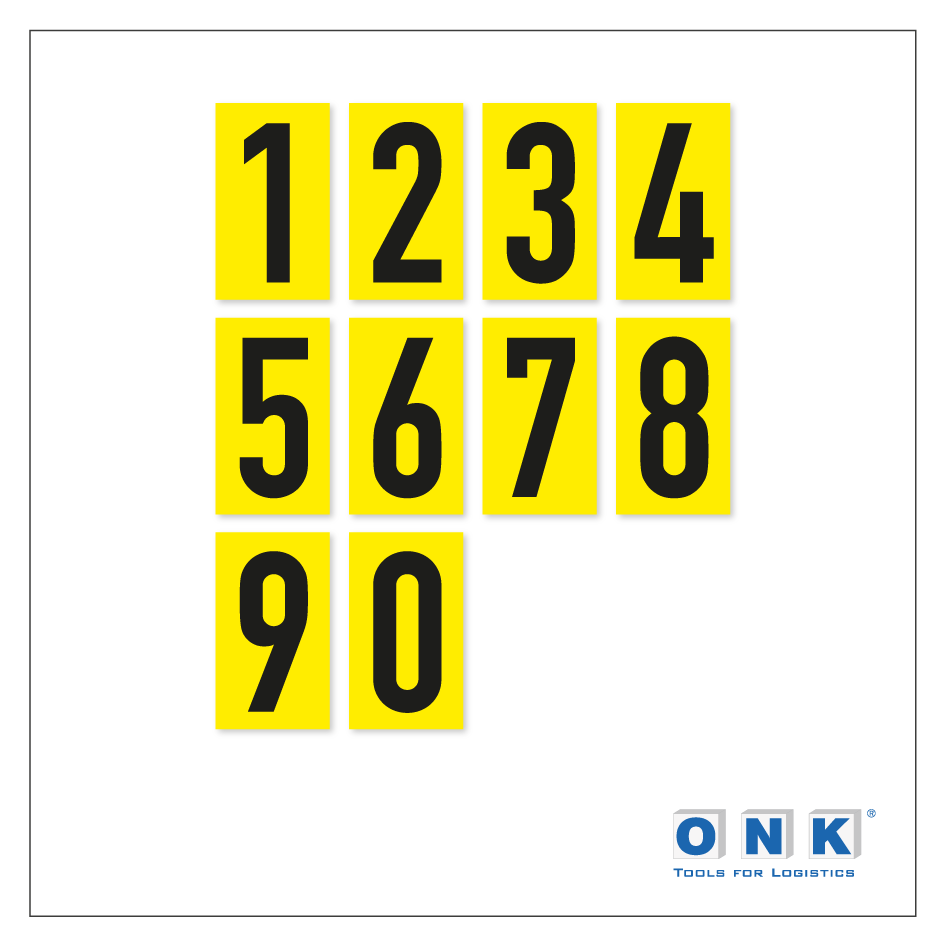 Selbstklebende Ziffern / Zahlen sind Bodenkennzeichnungselemente, die in Lagerhallen, Produktionsstätten und vielen anderen Arbeits- oder Sicherheitsbereichen zum Einsatz kommen, wo es auf eine eindeutige Standortbestimmung ankommt – z.B. von Palettenstellplätzen oder bestimmten Flächen. Unsere Zahlen sind äußerst strapazierfähig und auch für starke Beanspruchung durch Fahrzeuge (Stapler etc.) geeignet. Die Ziffern sind selbstverständlich auch für langlebige Verklebungen an Wänden oder Türen geeignet. Artikelausführung der Zahlen / Ziffern:Material: strapazierbare, formgestanzte PVC-Hartfolie, Stärke 0,6 mm (mit Schutzpapier 0,7), rückseitig mit einem stark haftenden Kleber ausgerüstet Abmessungen: in den Höhenvarianten 150 mm, 200 mm und 300 mm erhältlich Farbvarianten: gelb, orange, rot, blau, grün, weiß, schwarz  Verpackungseinheiten: einzelne Zahlen  Bitte beachten Sie: Je nach Produktionschargen können die Farbtöne etwas variieren. Diese produktionsbedingten Farbabweichungen sind nicht zu vermeiden und somit kein Reklamationsgrund.  Selbstklebende Bodenmarkierungen sind für eine dauerhafte Anwendung entwickelt, die Haftkraft des Klebers ist daher entsprechend stark und variiert auch je nach Bodenbeschaffenheit. Eine rückstandslose Entfernung kurz nach dem Verkleben ist je nach Bodenoberfläche eventuell möglich, kann jedoch nicht garantiert werden. Nach einer längeren Klebedauer ist eine rückstandslose Entfernung der Bodenmarkierung eher unwahrscheinlich. Eine bewährte Möglichkeit, eine möglichst rückstandslose Entfernung eventuell zu begünstigen, ist durch Wärmeeinwirkung gegeben. Aufkleber jeglicher Art bzw. der Kleber dieser Artikel verhalten sich nach dem Erwärmen (z.B. mit einem Fön) flexibler und lassen sich daher leichter ablösen. Dies kann aber ebenfalls nicht garantiert werden.