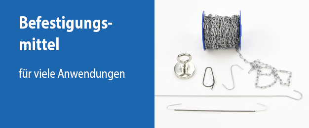 Mit dem richtigen Befestigungsmittel werden Schilder in Lager, Büro und an vielen anderen Orten gut lesbar an der gewünschten Stelle angebracht. Je nach Anwendungszweck gibt es das genau passende Material. Wir führen die passenden Befestigungen wie Gliederketten, S-Haken , Magnete u.v.m.