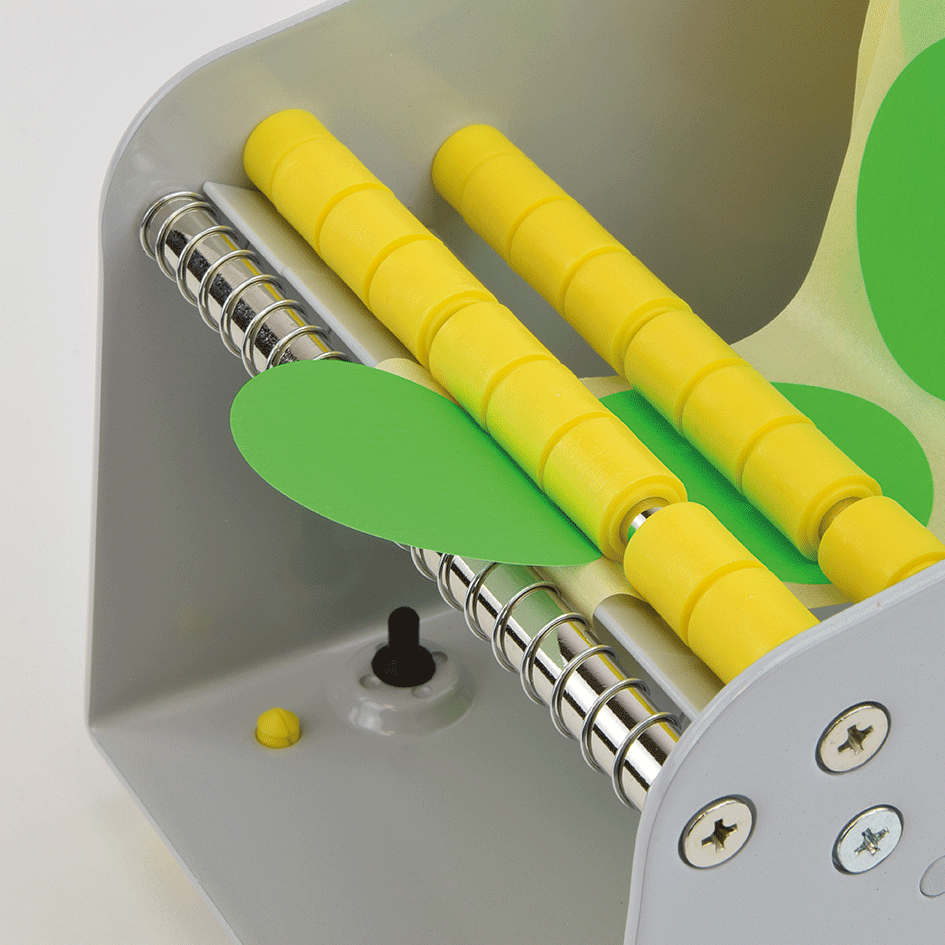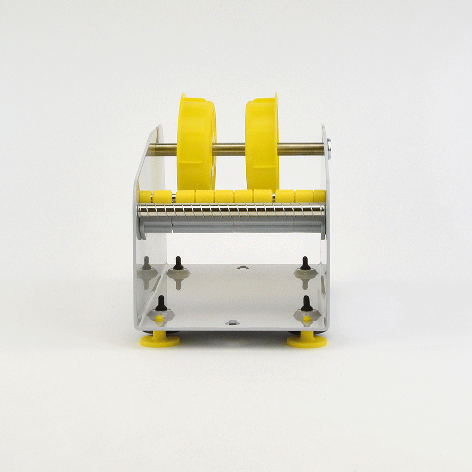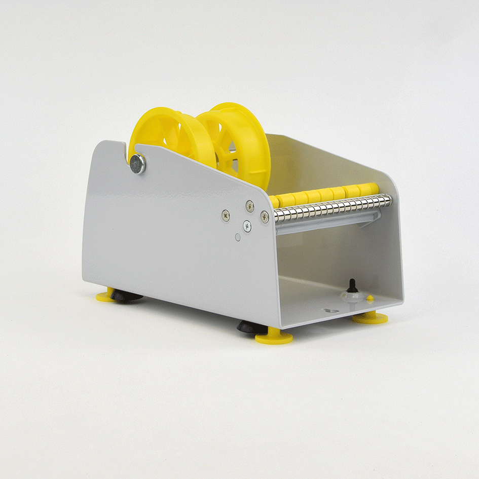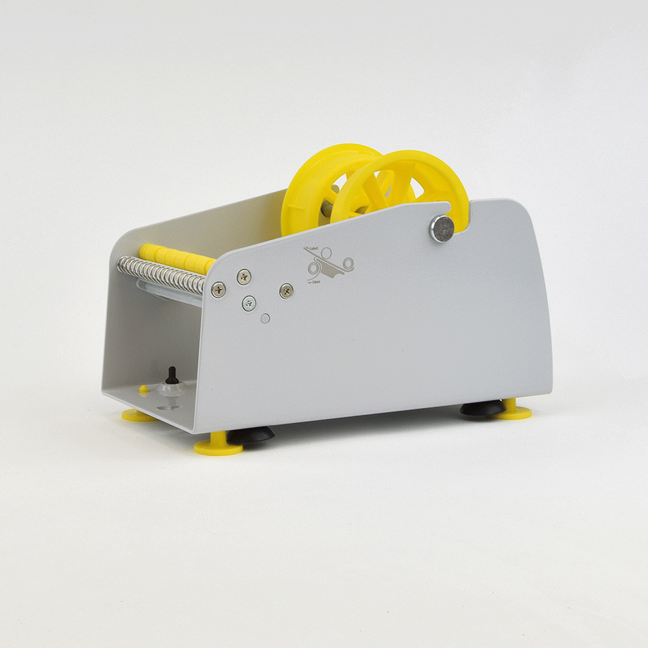 Das Trägerband der Etiketten wird an einer Walze vorbei über eine Kante geführt und umgelenkt. Bei dem Vorgang wird das Etikett vom Trägerband abgestreift und über die Kante geschoben von der man es nun einfach greifen kann. Der Etikettenspender verfügt über Saugnäpfe, welche sicheren Halt auf glatten Oberflächen bieten.