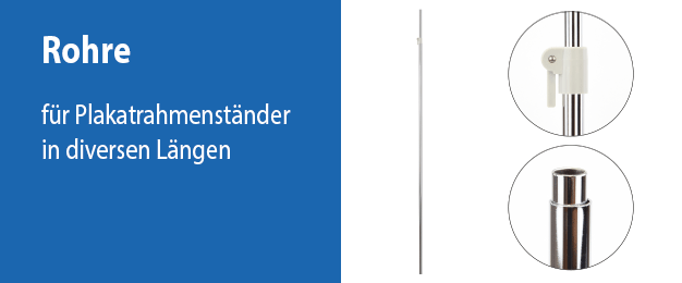 Das Teleskoprohr XXL ist hochwertig verchromt und besteht aus zwei ineinander geschobenen Stahlrohren, die sich mittels eines Feststellhebels auf die gewünschte Länge ausziehen und arretieren lassen. In Verbindung mit einer Fußplatte und einem aufgesteckten Plakatrahmen, sind Sie in der Lage, dieses Teleskoprohr bis zu 1.900 mm auszuziehen und so Artikelinformationen in einer hohen Position unübersehbar zu platzieren. Wir empfehlen, beim maximalen Auszug, die Verwendung einer schweren Fußplatte, um einen sicheren Stand zu gewährleisten. Für eine individuelle Zusammenstellung von Bodenplakatständern ist zu beachten, dass dieses Teleskoprohr nur für Fußplatten und Plakatrahmen mit einer Rohraufnahme von 12 mm geeignet ist. Merkmale dieses Teleskoprohres im XXL-Format:Material: verchromtes Stahlrohr grauer Kunststoff (Feststellhebel) Abmessungen: Außenrohr ø 12 mm, Wandstärke ca. 1 mm Innenrohr ø 10 mm, Wandstärke ca. 1 mm Feststellhebel: 32 x 25 x 16 mm, fest installiert am Außenrohr minimaler Auszug: 1.050 mm maximaler Auszug: 1.900 mm Ausführung: ausziehbares Teleskoprohr mit einer Arretierungsfunktion Verpackungseinheiten: 1 Teleskoprohr (zusammengeschoben) Bitte beachten Sie: Dieses Teleskoprohr ist nur für Fußplatten / Bodenständer und Plakatrahmen mit 12 mm-Aufnahmen geeignet. Dieses Teleskoprohr ist Bestandteil unserer Bodenplakatständer-Sets. Passende Fußplatten und Plakatrahmen finden Sie in unserem Zubehörbereich.
