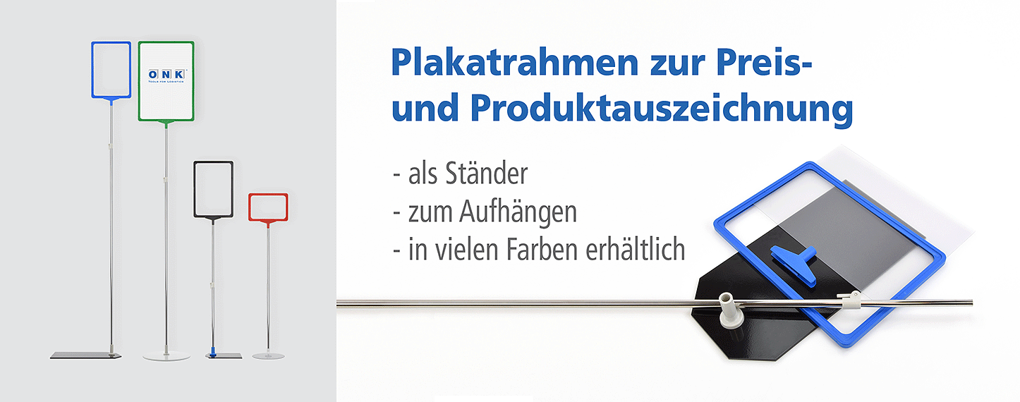 In den Formaten DIN A5, DIN A4 und DIN A3 sorgen unsere Plakatrahmen aus bruchsicherem Kunststoff und in neun Farben für sicheren Halt der eingeschobenen Dokumente, z.B. Artikelbeschreibungen, Preisauszeichnungen u.a. Ergänzt werden sie durch das passende Zubehör wie Fußplatte und Stahlrohr, Aufhängehaken, T-Stück und U-Taschen. Die Plakatrahmen lassen sich unter Paletten schieben oder frei hinstellen. Im Set ist dieses Organisationsmittel als Bodenplakat- und Palettenständer mit höhenverstellbarem Chromrohr und Metallfußplatte erhältlich.