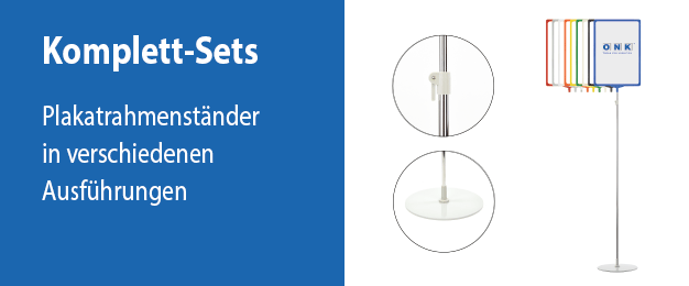 Dieses Bodenplakatständer-Set ist als Informationsträger außerordentlich flexibel und wird gleichermaßen im Lager zur Stellplatzauszeichnung wie auch zur Verkaufsförderung in Publikumsbereichen oder zur Vermittlung wichtiger Informationen in Betrieben, Schulen, Bibliotheken und anderen Stätten verwendet. Das mehrteilige Ständer-Set überzeugt mit seiner stabilen und flexiblen Ausführung – die schwere Fußplatte garantiert einen sicheren Stand, das verchromte Teleskoprohr läßt sich bis zu einer Höhe von 1.900 mm ausziehen. Zusammen mit den Plakatrahmen, die in zwei Größen und diversen Farben erhältlich sind, ist eine individuelle und gut sichtbare Kennzeichnung leicht zu realisieren. Das Wechseln von Informationen ist zudem einfach und sehr schnell erledigt: ein handbeschriebenes oder ausgedrucktes Blatt Papier wird einfach in den Plakatrahmen eingeschoben. Die offene Bauweise der Plakatrahmen ermöglichen zudem eine beidseitige Sichtbarkeit der eingelegten Inhalte – es müssen lediglich zwei Papierblätter, Rücken an Rücken gelegt, im Rahmen platziert werden. Merkmale des Bodenplakatständer - Sets:Material: Plakatrahmen und Rahmenhalter (T-Stück): farbiger Hartkunststoff Ausziehbare Stange: verchromter Stahl, Stärke 12 mm, Auszugfeststellhebel: Kunststoff Ständerfuß: massives, grau pulverbeschichtetes Metall, aufgeschraubter Rohrhalter: Hartkunststoff Abmessungen: Plakatrahmen DIN A4: Außenformat 220 x 310 x 11 mm - für Inhalte im Format DIN A4 Plakatrahmen DIN A3: Außenformat 310 x 430 x 11 mm - für Inhalte im Format DIN A3 Plakatrahmenhalter: 90 x 50 x 16 mm Ständerfuß: schwere Ausführung, rund, ø 255 mm, Stärke 5 mm, Rohrhalter: 50 mm hoch Teleskopstange: eingezogen ca. 1.050 mm, ausgezogen ca. 1.900 mm Ausführung: Der Aufbau des Palettenständers basiert auf einem Steck- und Klicksystem. Werkzeug zum Zusammenbauen ist daher nicht erforderlich. Verpackungseinheiten: Das Palettenständer-Set wird in Einzelteilen wie folgt geliefert: mit einem runden Ständerfuß, einem Plakatrahmen, einem Plakatrahmenhalter (T-Stück), einer verchromte Teleskopstange Bitte beachten Sie: Die transparente PVC-Dokumententasche (U-Tasche), wie in manchen Darstellungen abgebildet, ist nicht Bestandteil des Sets. Diese U-Tasche muss separat erworben werden . Zur U-Tasche. Für eine optimale beidseitige Sichtbarkeit sollten zwei Blätter eingeschoben werden. Ein beidseitig bedrucktes Blatt kann zwar ebenfalls benutzt werden, jedoch scheinen die Motive auf den anderen Seiten durch, so dass die Lesbarkeit nicht optimal ist. Dies kann jedoch durch die Verwendung eines stärkeren Kartons minimiert werden. Bei Gegenlicht ist hingegen eine Blickdichtigkeit erforderlich, die nur erreicht wird, wenn zwischen zwei Blättern ein schwarzer Karton oder eine schwarze Folie in gleicher Papiergröße eingelegt wird. Die Teile dieses Ständer-Sets können als Ersatz oder zur Erweiterung auch einzeln erworben werden.