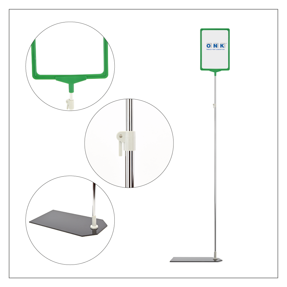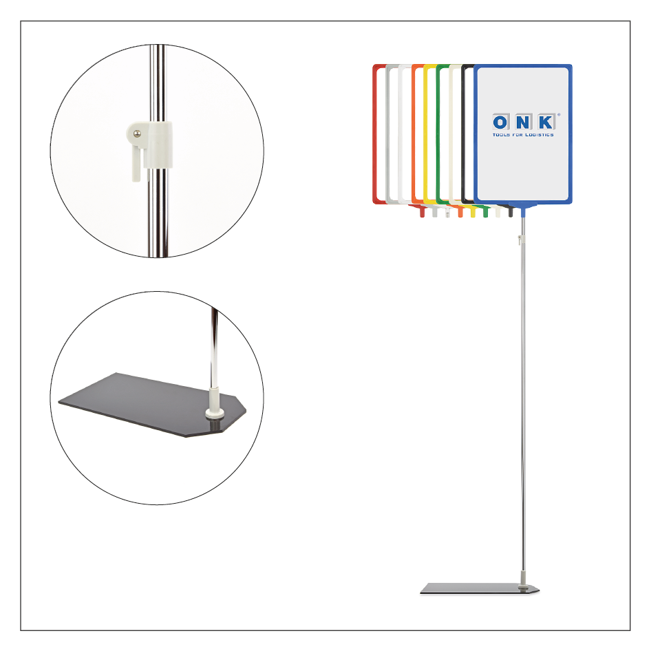 Dieses Palettenständer-Set stellt eine hervorragende Lösung zur Kennzeichnung von Palettenstellplätzen im Lager dar, ist aber auch gleichermaßen zur Verkaufsförderung in Publikumsbereichen oder zur Vermittlung wichtiger Informationen in Betrieben, Schulen, Bibliotheken und anderen Stätten geeignet. Das mehrteilige Ständer-Set überzeugt mit seiner stabilen und flexiblen Ausführung – die schwere Fußplatte garantiert einen sicheren Stand, der im Lagerbereich durch die zusätzliche Belastung mit einer Palette noch erhöht werden kann, das verchromte Teleskoprohr läßt sich bis zu einer Höhe von 1.900 mm ausziehen. Zusammen mit den Plakatrahmen, die in zwei Größen und diversen Farben erhältlich sind, ist eine individuelle und gut sichtbare Kennzeichnung leicht zu realisieren. Das Wechseln von Informationen ist zudem einfach und sehr schnell erledigt: ein handbeschriebenes oder ausgedrucktes Blatt Papier wird einfach in den Plakatrahmen eingeschoben. Die offene Bauweise der Plakatrahmen ermöglichen zudem eine beidseitige Sichtbarkeit der eingelegten Inhalte – es müssen lediglich zwei Papierblätter, Rücken an Rücken gelegt, im Rahmen platziert werden.