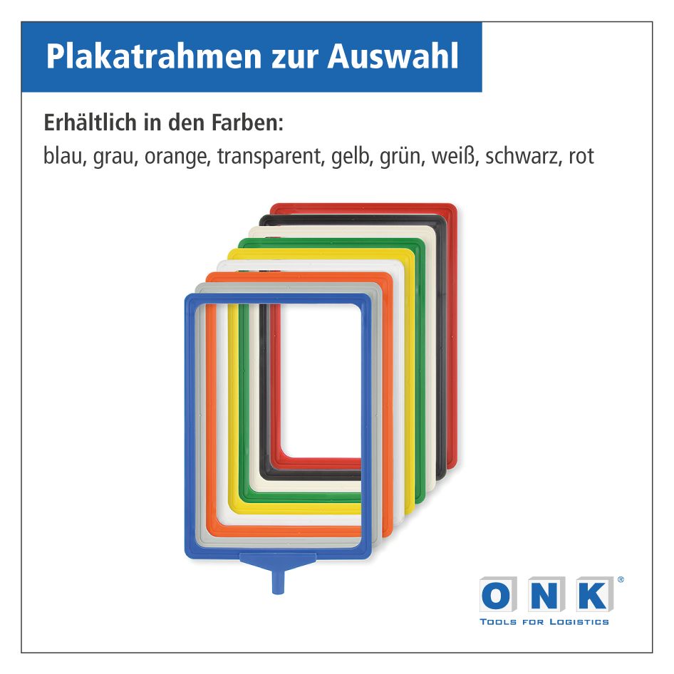 Plakatrahmen sind die Klassiker zur Preis- und Produktkennzeichnung, auffällig in der Erscheinung und flexibel einsetzbar. Ein Plakatrahmen ist ein beidseitig offener Kunststoffrahmen mit einem seitlichen Schlitz, in den eine Unterlagentasche (U-Tasche) mit ein- oder beidseitig lesbaren Informationen eingeschoben wird. Je nach Nutzung des Rahmens (im Hoch- oder Querformat) ist der Unterlagenschlitz auf der kurzen oder langen Seite des Plakatrahmens angeordnet. Unsere Plakatrahmen sind in neun Farbvarianten und drei Größen erhältlich, sie kommen in der Regel auf Bodenständern zum Einsatz, können aber auch mittels spezieller Haken aufgehängt werden. Entsprechende Befestigungsartikel finden Sie im Zubehörbereich. Merkmale des Plakatrahmens zur Preis- und Produktauszeichnung:Material: farbiger Hartkunststoff Abmessungen: für Inhalte im Format DIN A5 (210 x 148 mm), Rahmenstärke 11 mm für Inhalte im Format DIN A4 (297 x 210 mm), Rahmenstärke 11 mm für Inhalte im Format DIN A3 (420 x 297 mm), Rahmenstärke 11 mm Ausführung: beidseitig offener Rahmen mit einer geschlitzten Seite zur Unterlagenaufnahme in den Farben gelb, grün, grau, transparent, rot, weiß, orange, schwarz und blau erhältlich Verpackungseinheiten: 1 Plakatrahmen (ohne Einschubtasche oder anderem Zubehör) Bitte beachten Sie: Plakatrahmen können mit entsprechendem Zubehör für Plakatbodenständer oder zum Aufhängen verwendet werden. Für eine optimale beidseitige Sichtbarkeit sollten zwei Blätter eingeschoben werden. Ein beidseitig bedrucktes Blatt kann zwar ebenfalls benutzt werden, jedoch scheinen die Motive auf den anderen Seiten durch, so dass die Lesbarkeit nicht optimal ist. Dies kann jedoch durch die Verwendung eines stärkeren Kartons minimiert werden. Bei Gegenlicht ist hingegen eine Blickdichtigkeit erforderlich, die nur erreicht wird, wenn zwischen zwei Blättern ein schwarzer Karton oder eine schwarze Folie in gleicher Papiergröße eingelegt wird. Die Plakatrahmen im DIN A4 und DIN A3-Format sind Bestandteil unserer Bodenplakatständer-Sets.