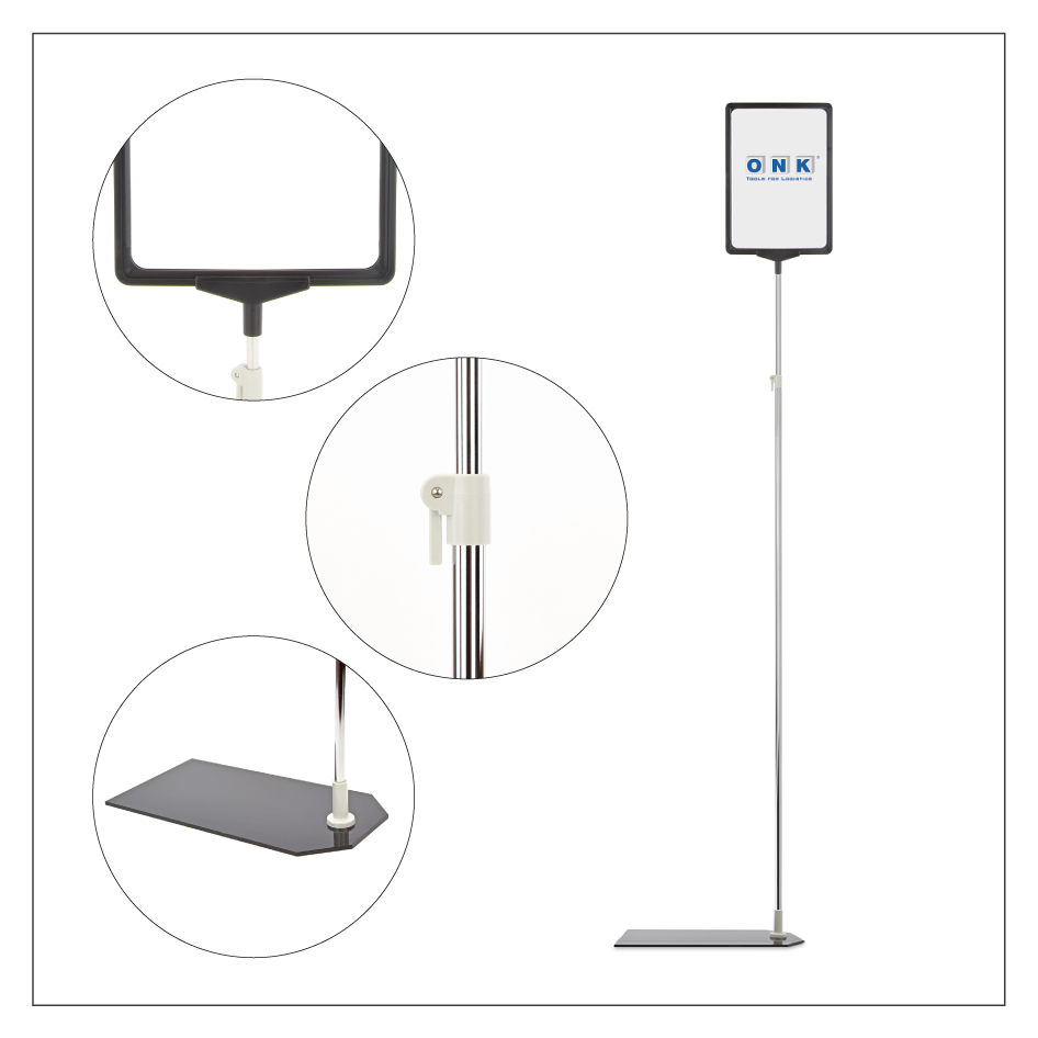Dieses Palettenständer-Set stellt eine hervorragende Lösung zur Kennzeichnung von Palettenstellplätzen im Lager dar, ist aber auch gleichermaßen zur Verkaufsförderung in Publikumsbereichen oder zur Vermittlung wichtiger Informationen in Betrieben, Schulen, Bibliotheken und anderen Stätten geeignet. Das mehrteilige Ständer-Set überzeugt mit seiner stabilen und flexiblen Ausführung – die schwere Fußplatte garantiert einen sicheren Stand, der im Lagerbereich durch die zusätzliche Belastung mit einer Palette noch erhöht werden kann, das verchromte Teleskoprohr läßt sich bis zu einer Höhe von 1.900 mm ausziehen. Zusammen mit den Plakatrahmen, die in zwei Größen und diversen Farben erhältlich sind, ist eine individuelle und gut sichtbare Kennzeichnung leicht zu realisieren. Das Wechseln von Informationen ist zudem einfach und sehr schnell erledigt: ein handbeschriebenes oder ausgedrucktes Blatt Papier wird einfach in den Plakatrahmen eingeschoben. Die offene Bauweise der Plakatrahmen ermöglichen zudem eine beidseitige Sichtbarkeit der eingelegten Inhalte – es müssen lediglich zwei Papierblätter, Rücken an Rücken gelegt, im Rahmen platziert werden.