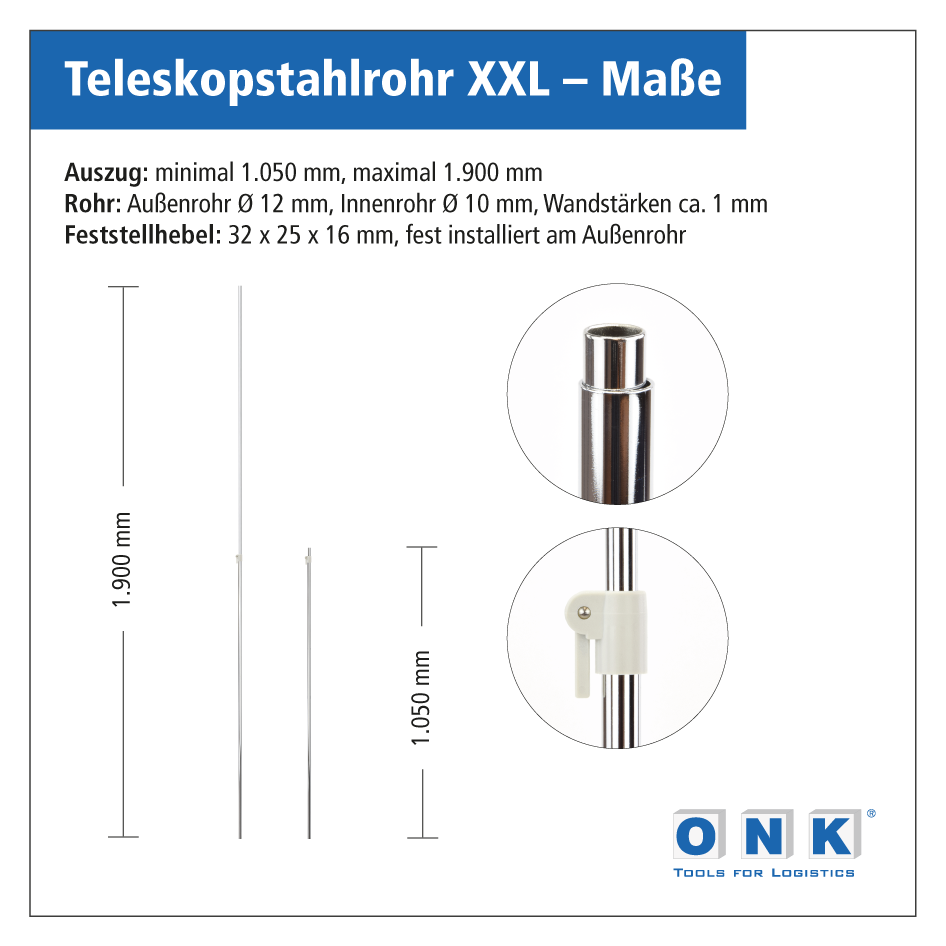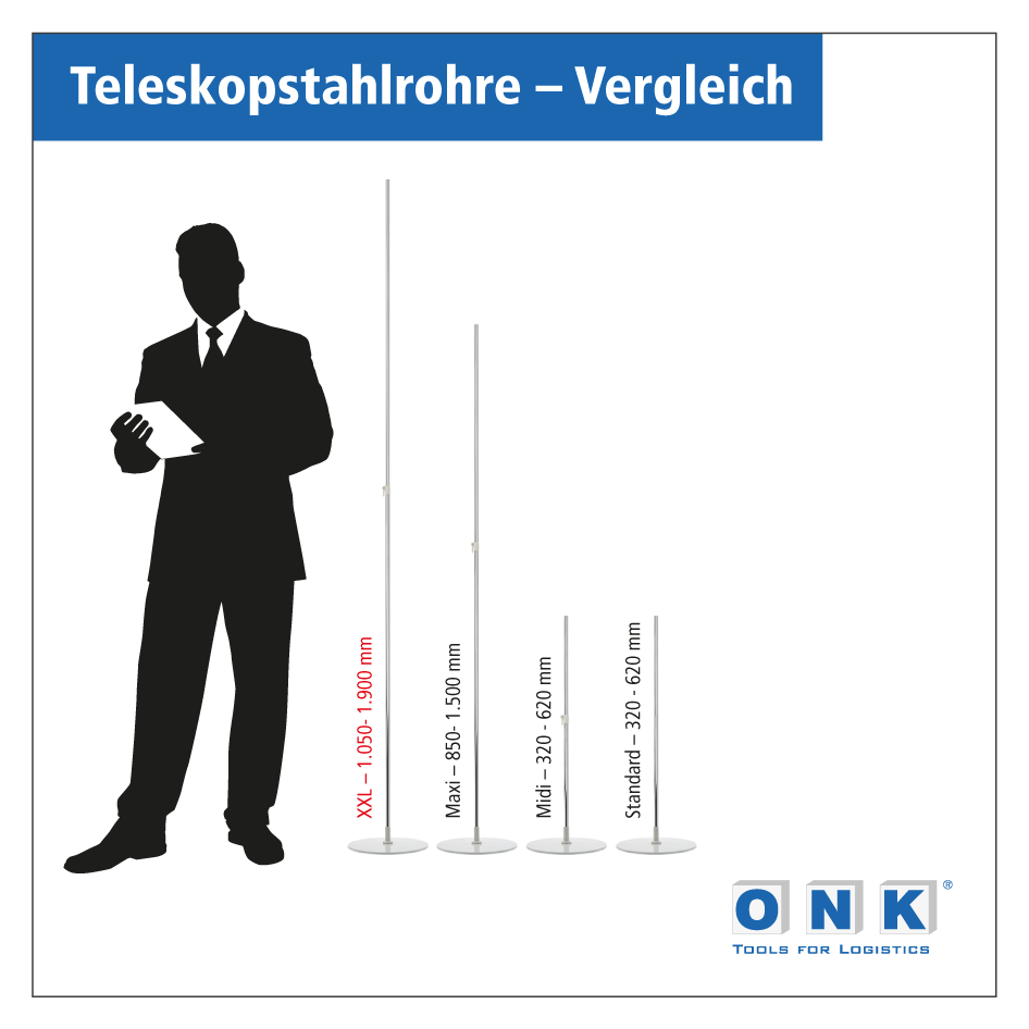 Das Teleskoprohr XXL ist hochwertig verchromt und besteht aus zwei ineinander geschobenen Stahlrohren, die sich mittels eines Feststellhebels auf die gewünschte Länge ausziehen und arretieren lassen. In Verbindung mit einer Fußplatte und einem aufgesteckten Plakatrahmen, sind Sie in der Lage, dieses Teleskoprohr bis zu 1.900 mm auszuziehen und so Artikelinformationen in einer hohen Position unübersehbar zu platzieren. Wir empfehlen, beim maximalen Auszug, die Verwendung einer schweren Fußplatte, um einen sicheren Stand zu gewährleisten. Für eine individuelle Zusammenstellung von Bodenplakatständern ist zu beachten, dass dieses Teleskoprohr nur für Fußplatten und Plakatrahmen mit einer Rohraufnahme von 12 mm geeignet ist.