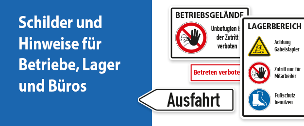 Wir führen in unserem Logistik-Shop eine Auswahl geeigneter Schilder und Kennzeichnungen für Unternehmen, Betriebsgelände, Lager und Büros in verschiedenen Größen und Ausführungen, als Einzelzeichen oder in Kombination mit Textinhalten, um den gängigen Anforderungen an eine zielgerichtete Betriebsbeschilderung gerecht zu werden, produzieren aber auch bedarfsbezogen nach Ihren Vorgaben und dem jeweiligen Verwendungszweck entsprechend.