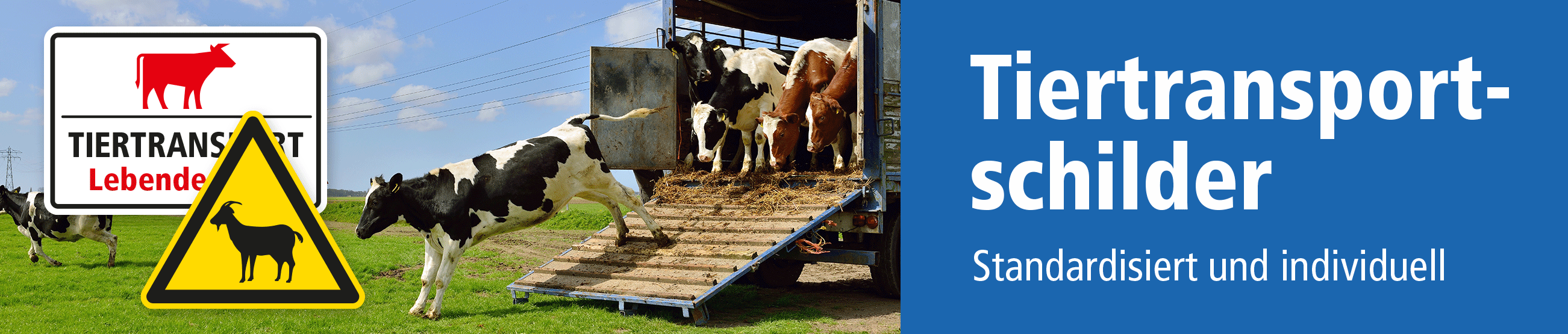 Wir führen zahlreiche Schilder und Aufkleber zur Kennzeichnung von Tiertransporten – als einzelne Warnzeichen mit Abbildungen der Tiergattung (Schaf, Rind, Huhn, Ziege, Schwein, Pferd, Gans), aber auch in Kombination mit eindeutigen Textinhalten in vielen Ausführungen. Zudem können die meisten Schilder und Hinweise auch in einer reflektierenden Ausführung bezogen werden, um in der Dämmerung oder Dunkelheit von Verkehrsteilnehmern besser wahrgenommen zu werden. Sie wünschen ein Schild in einer anderen Größe, Farbvariante oder mit einer Tierabbildung, die wir momentan nicht führen? Fragen Sie uns. Wir fertigen Schilder zu Tiertransporten nach Ihren Vorgaben, auch in Sondergrößen. Gerne unterbreiten wir Ihnen unser Angebot.