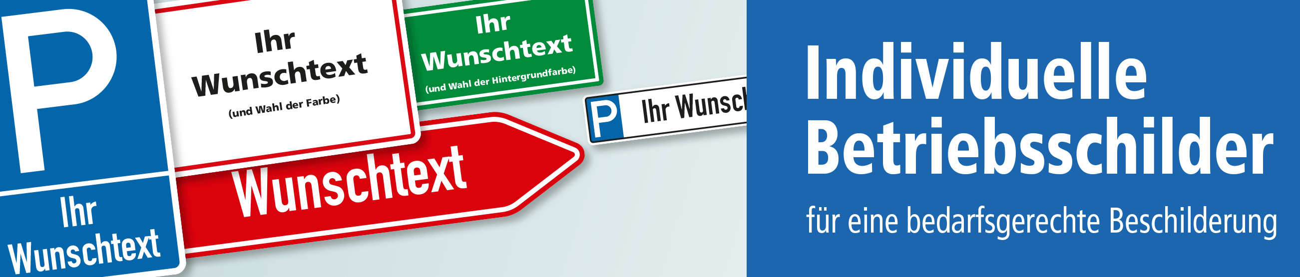 Bitte beachten Sie, dass unsere individuellen Schilder wie auch andere Schilder nur für eine Beschilderung auf Betriebsgrundstücken und privaten Liegenschaften sowie in Gebäuden eingesetzt werden können, nicht im öffentlichen Straßenverkehr. Eine Nutzung auf öffentlichen Räumen erfordert stets eine behördliche Genehmigung.