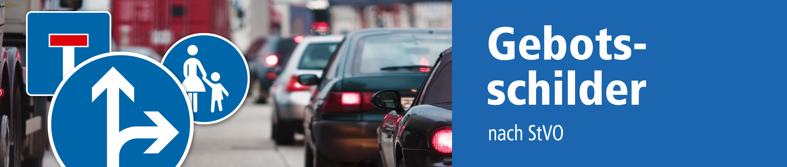 Vorschriftszeichen bzw. Gebotsschilder sind Verkehrsschilder, die mit Geboten und Verhaltensweisen die Sicherheit im öffentlichen wie auch betrieblichen Straßenverkehr regeln. Dies erfolgt in der Regel mit runden, aber auch rechteckigen, blauen Verkehrszeichen mit weißen Symbolen. Diese Symbole können Pfeile zur vorgeschriebenen Fahrtrichtung darstellen, aber auch Fahrzeuge – z. B. ein Fahrrad, das einen Fahrradweg auszeichnet. Gebotszeichen gelten ab der Aufstellung bis zu ihrer Aufhebung oder anderen Schildern, die eine neue Verkehrsregelung vorsehen. Wir führen die gängigsten Gebotsschilder als einzelne Verkehrszeichen.