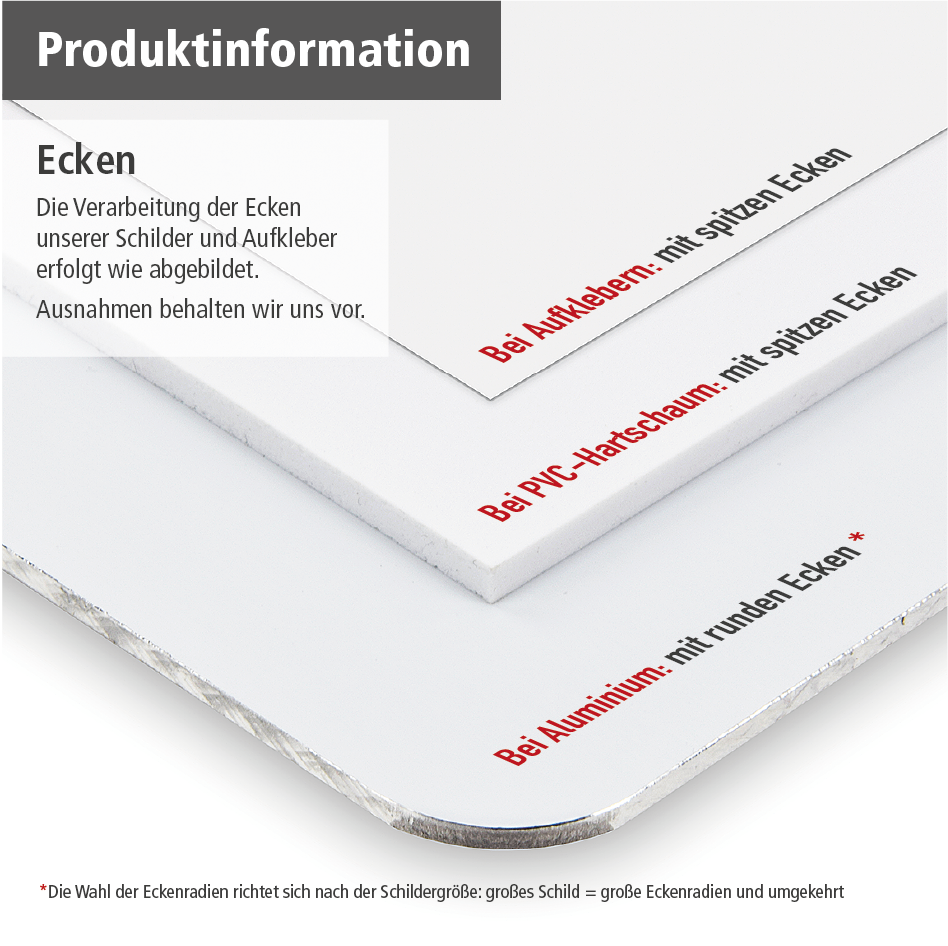 Verarbeitung: rechteckig beschnitten mit runden Ecken (Aufkleber und PVC-Hartschaum-Schilder werden nur rechteckig beschnitten)