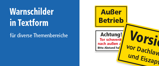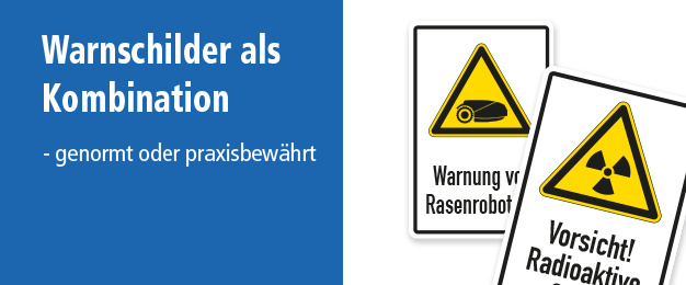 Wir führen Warnschilder in zahlreichen Themen, Größen und Ausführungen – als einzelne Warnzeichen mit einer unmissverständlichen Sicherheitssymbolik nach den Normen ISO 7010, ASR 1.3, ISO 20712-1 sowie älteren Normen, als praxisbewährte Warnzeichen für eine bedarfsgerechte Sicherheitskennzeichnung, aber auch als Kombinationsschilder mit zusätzlichen Textinhalten, die die Bedeutung der Warnzeichen mit geeigneten Hinweisen unterstreichen oder aufgrund bestimmter, praxisorientierter Gegebenheit erforderlich sind. Warnschilder und Warnhinweise mit reinen Textinhalten runden unser Angebot ab. Für eine bessere Wahrnehmung beim Anstrahlen durch eine externe Lichtquelle (Taschenlampe oder Autoscheinwerfer) sind alle Kombinationsschilder auch in einer reflektierenden Ausführung erhältlich.